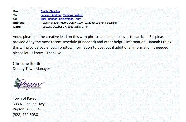A “backend” pull suggests that all email records are retained in an electronic format. Reviewing the .pdf documents the attachments provided cannot be matched to the emails. The attachments lack context. The emails contain redacted information that has no apparent basis for redaction. The effort by the Town of Payson to circumvent the valid request appears significant. We are confident that effort would be better spent honoring the request. What is the Town of Payson hiding?