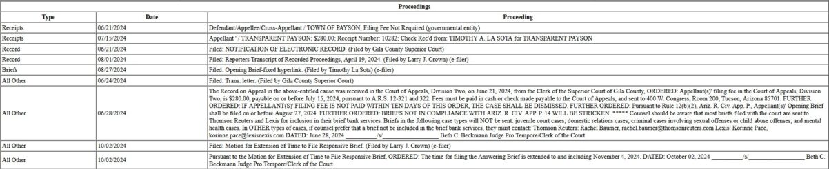 On August 27, 2024, Transparent Payson and Jeffrey Aal filed a Notice of Appeal with the Arizona Court of Appeals to appeal the Superior Courts final judgement.